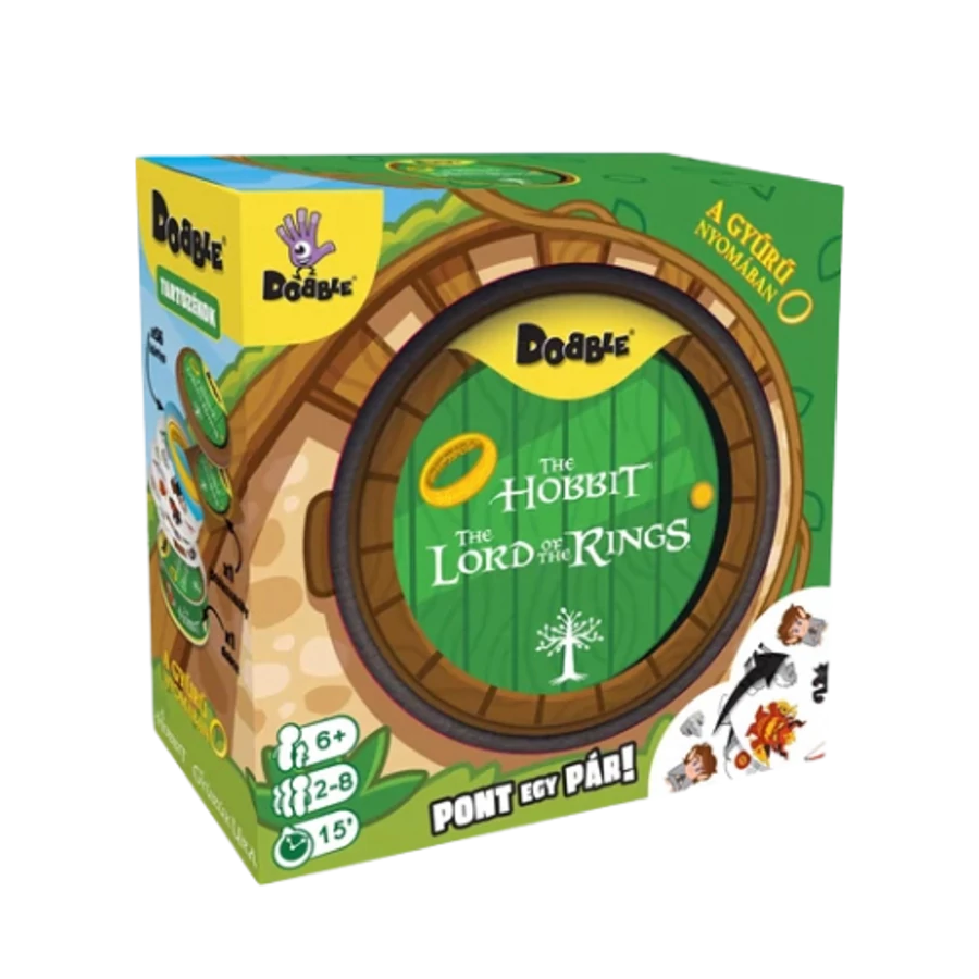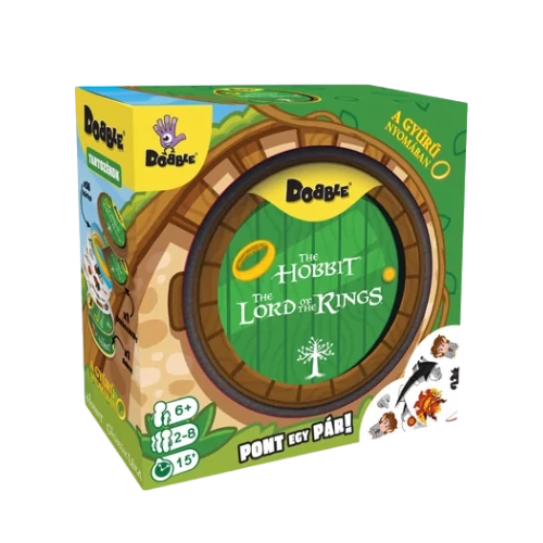 Dobble – A Gyűrű nyomában: egyszerű, pörgős és mókás társasjáték, amelyben a reflexek és a figyelem döntenek! A klasszikus Dobble mechanikát most a Gyűrűk Ura világának ikonikus szereplői és jelképei teszik még izgalmasabbá. Az illusztrált kártyákon ott vannak kedvenc karaktereid és tárgyaid: Gandalf botja, Frodó, Legolas, Smaug vagy éppen az Egy Gyűrű. A szabály: bármely két kártyán mindig pontosan egy azonos szimbólum található – aki előbb felismeri és kimondja, előnyhöz jut!